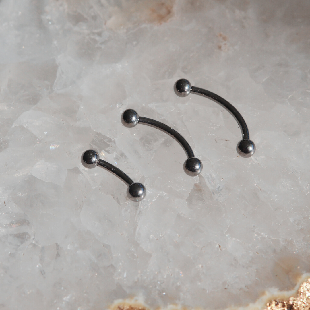 Minimalist and versatile, Bare Curved is designed to follow the natural shape of your piercing. Smooth titanium ends and a curved silhouette make it perfect for eyebrow, rook, vertical labret, and other curved barbell placements.