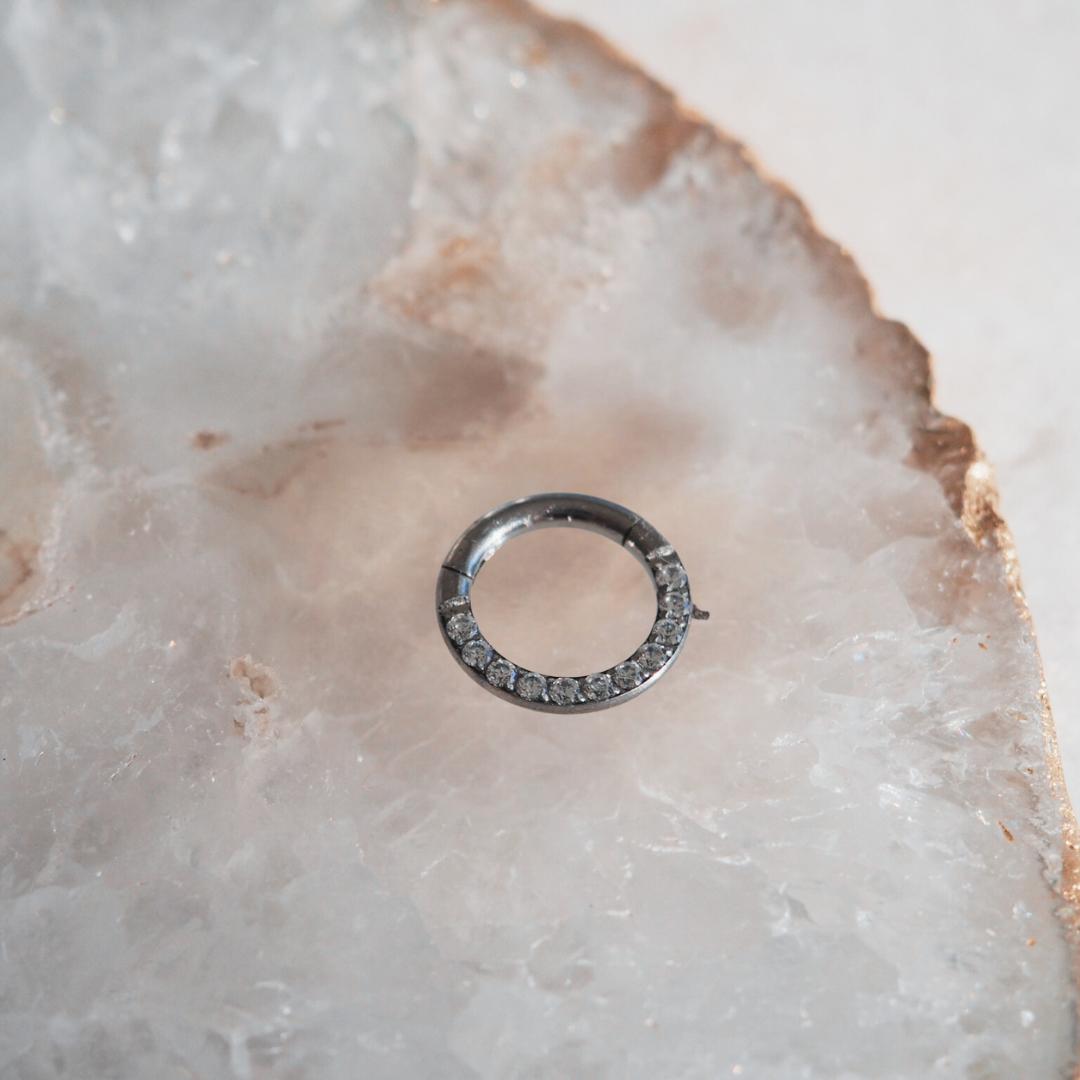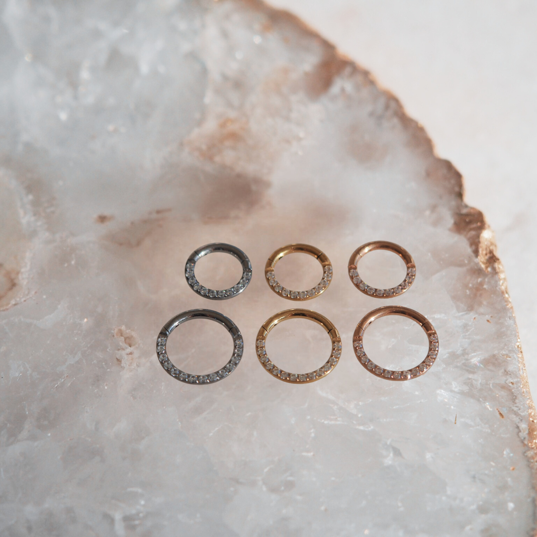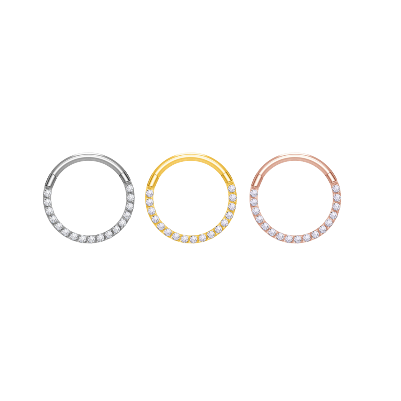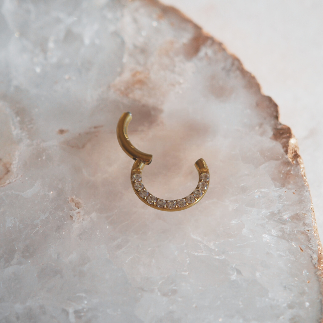 All eyes on you. Sovereign wraps a sleek hinged clicker in a full crown of brilliant cubic zirconia, set in high-polish gold for maximum impact. Comfortable enough for everyday wear but unapologetically bold, it’s a piece that commands attention without saying a word.