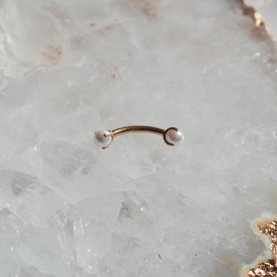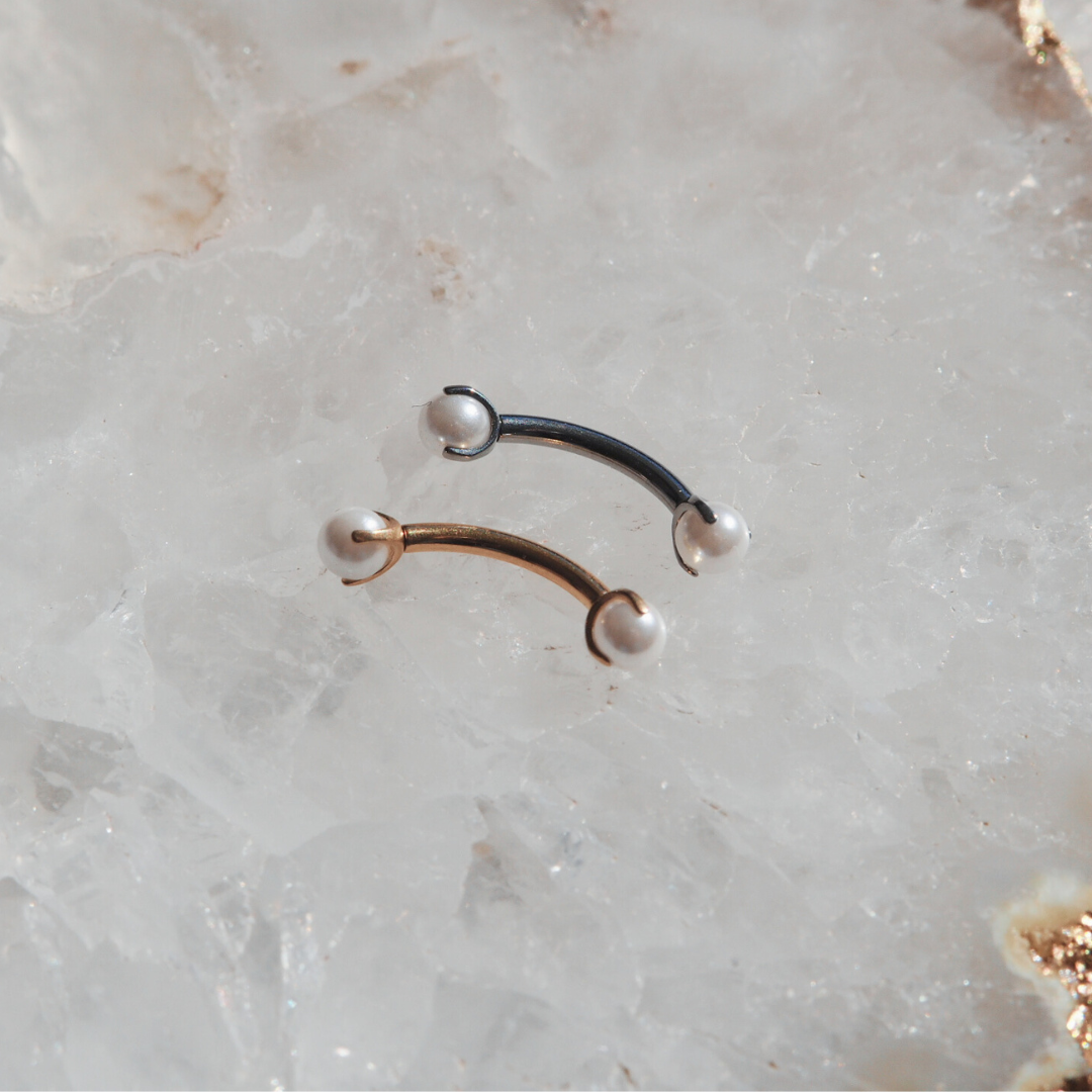 Minimalist curves meet timeless elegance. Lustrous manufactured pearl ends frame the gentle arc of this design, bringing a refined, understated statement to eyebrow, rook, vertical labret, and other curved barbell placements.